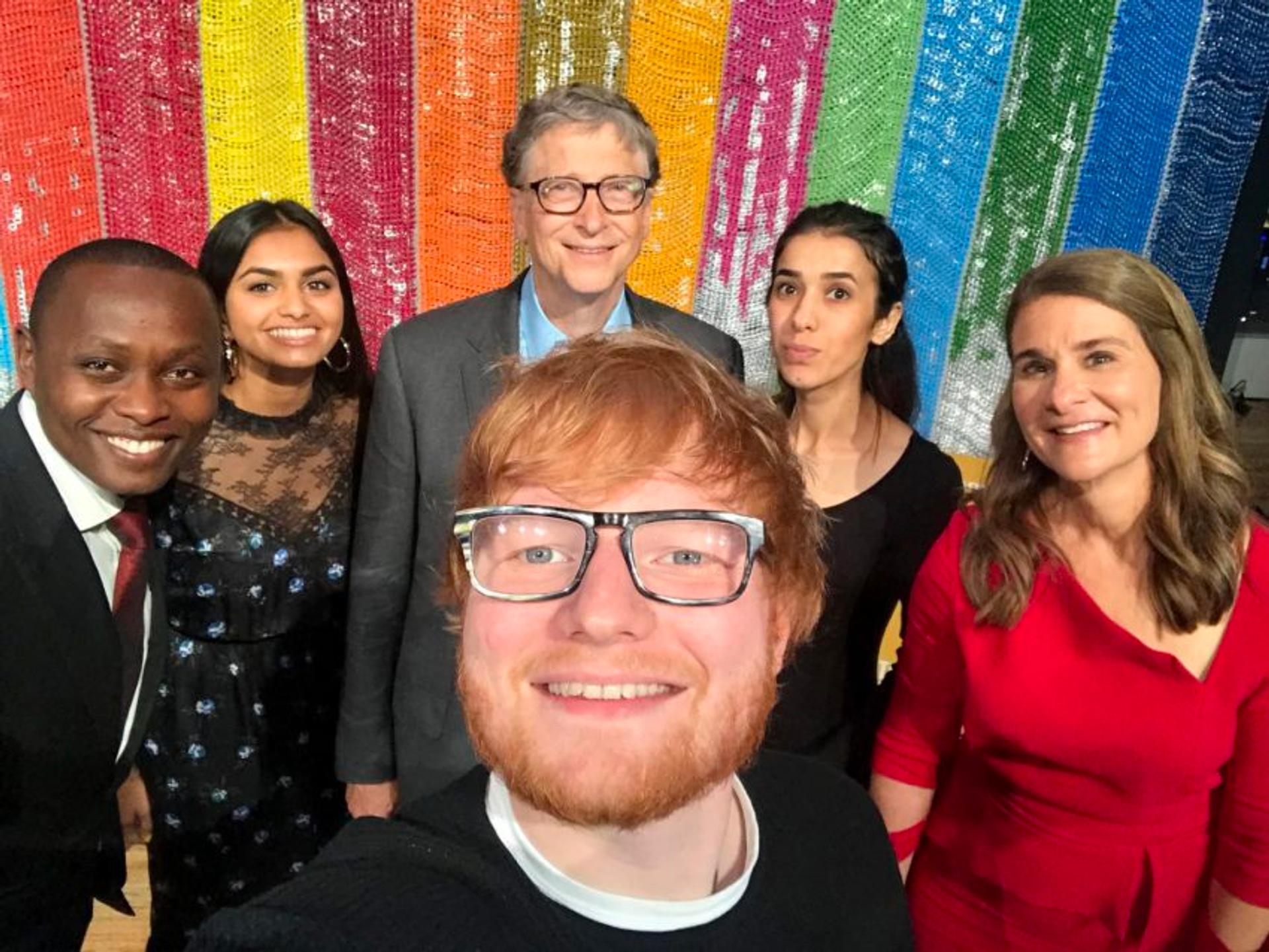 MÅLVAKTER: Fra venstre: Dysmus Kisilu, Amika George, Bill Gates, Ed Sheeran, Nadia Murad og Melinda Gates. Bildet er tatt på en konferanse i regi av Bill og Melinda Gates Foundation og UNICEF i 2018. Arrangementet feiret enestående ungdom og deres arbeid knyttet til FNs 17 globale mål. Foto: Getty Images.
