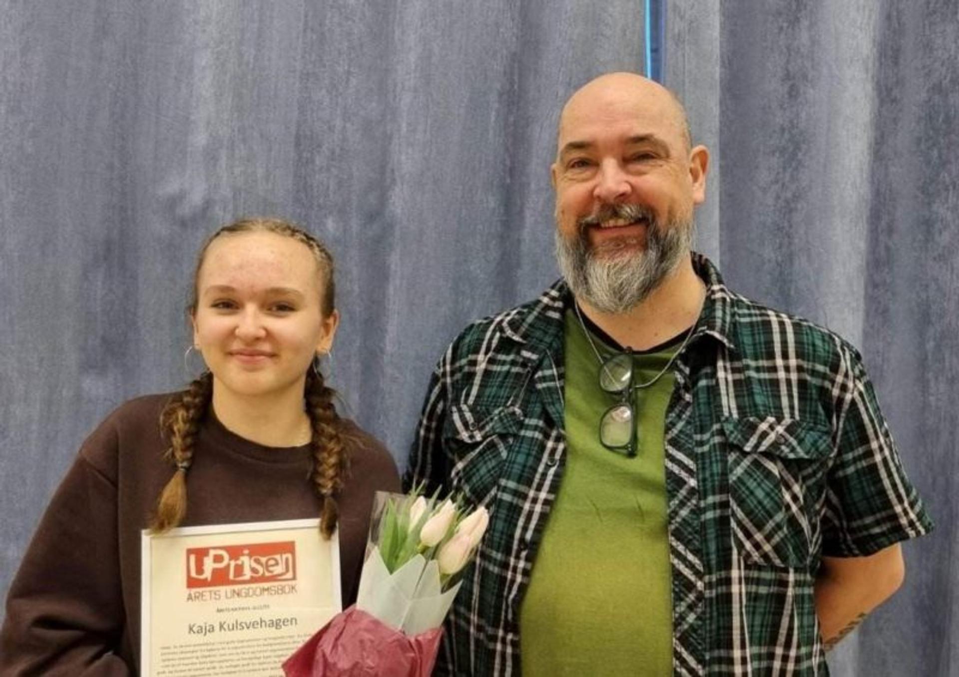 Kaja og de andre elevene på ungdomstrinnet på skolen har lest og skrevet mange anmeldelser av norske ungdomsbøker i Uprisen høsten 2022. Mandag 23.januar under et forfatterbesøk med Uprisnominerte Jan Tore Noreng, fikk Kaja en overraskelse da forfatteren annonserte at hun var kåret til Årets kritiker.